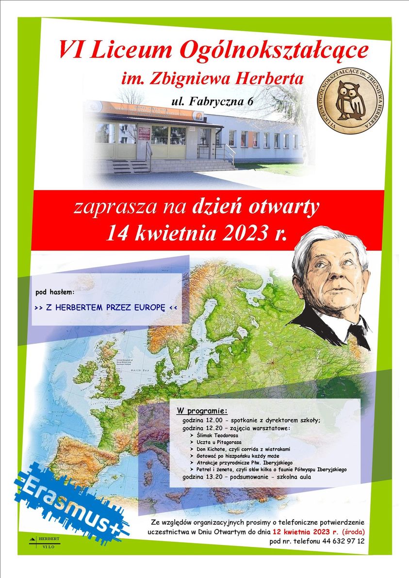 Dyrekcja, Grono Pedagogiczne oraz Uczniowie VI Liceum Ogólnokształcącego im. Zbigniewa Herberta w Bełchatowie serdecznie zapraszają uczniów klas ósmych szkół podstawowych na DZIEŃ OTWARTY, który odbędzie się dnia 14 kwietnia 2023 r. w godzinach od 12.00 do 14.00. W trakcie spotkania będzie można zapoznać się z ofertą edukacyjną szkoły, spotkać się i porozmawiać z nauczycielami, a także uczniami, zwiedzić szkołę oraz wziąć udział w ciekawych warsztatach.